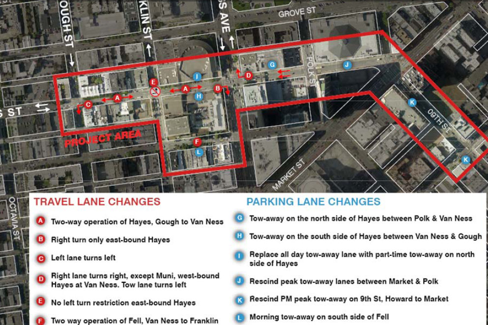 It would affect Hayes Street from Van Ness to Gough and Fell Street from Van Ness to Franklin, which residents described as multi-lane, one-way arterials that “inundate” the commercial district with “walls of cars.”