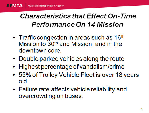 The 14-Mission currently operates at an average speed of 6.9 mph, “just under” the system-wide average, said Haley, and on-time performance reportedly rates at 69 percent, compared to 72 percent for all lines.