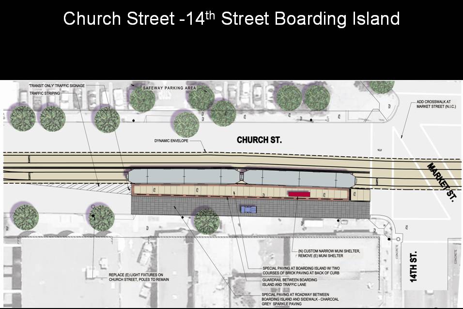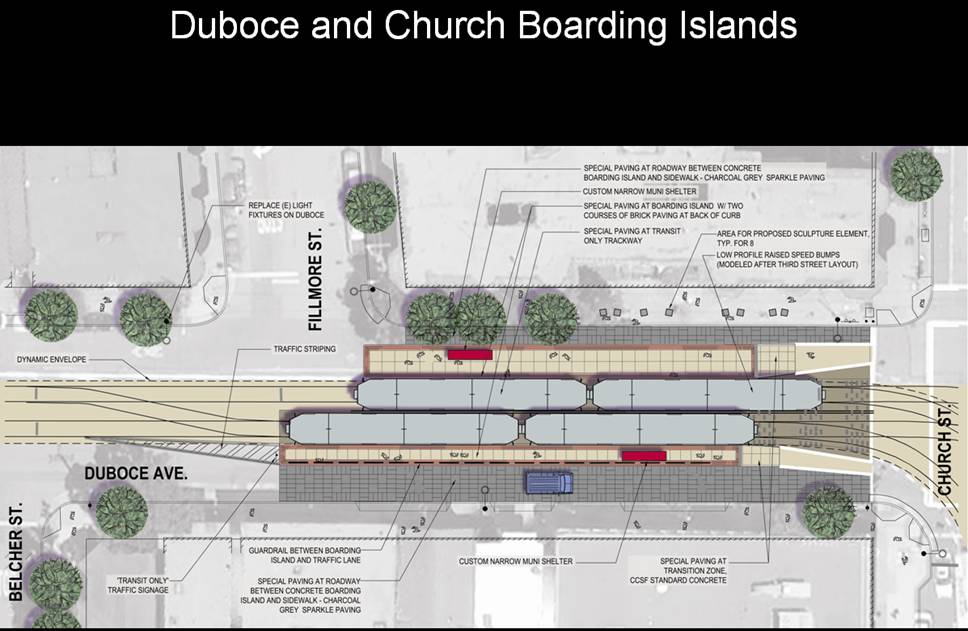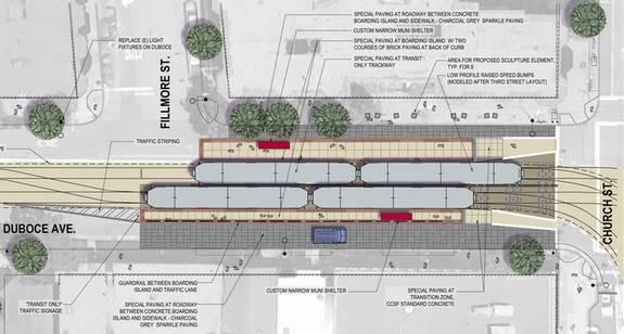 The project comes bearing gifts for all non-motorized users. Physical changes will be made to help delineate dedicated transit, pedestrian and bicycle space at the crowded Duboce and Church Muni stop. Access will be prohibited to automobiles on the westbound block of Duboce Avenue from Church to Fillmore, with the travel lane restricted to bikes only. That space will be painted green in order to encourage those accessing the Muni island to cross the bike lane carefully, said SFMTA spokeserson Paul Rose.
