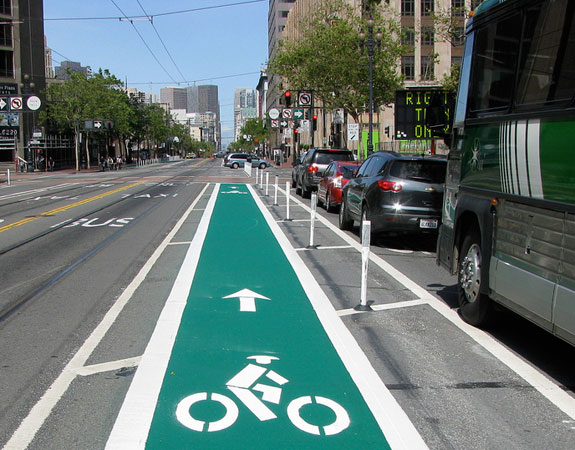 The SFMTA’s Papandreou worries that if the California standards aren’t changed soon, San Francisco will have trouble meeting its goal of making 20 percent of all trips by bicycle by 2020. That’s because obtaining state and federal funding for innovative treatments such as green bike lanes can be difficult if the treatment is not a recognized state standard.