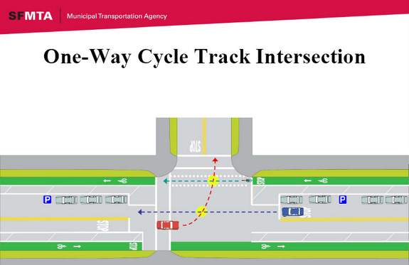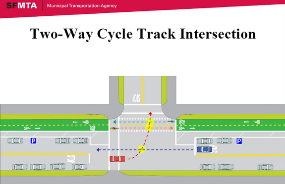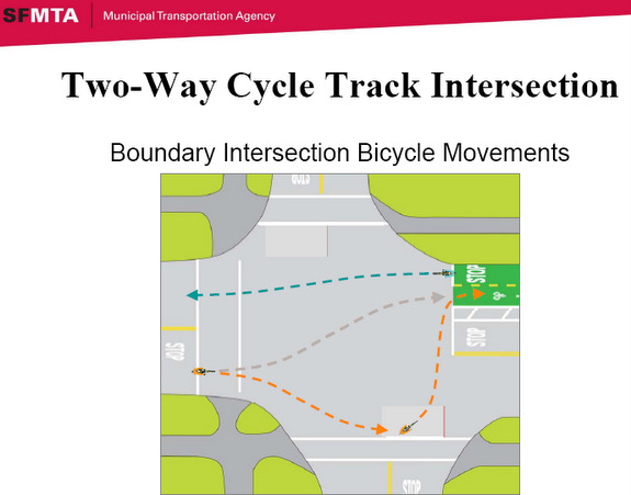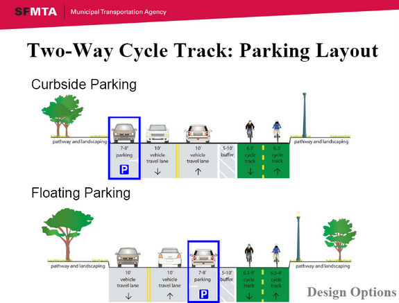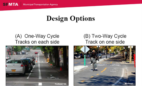 In his presentation [PDF], SFMTA Project Manager Antonio Piccagli explained that a two-way cycle track, which would require less buffer space than the alternative, would leave more room for a protective parking lane along the bikeway. However, he said, it also holds more potential for conflicts with drivers and could be difficult for riders to enter it at the intersections where it begins.