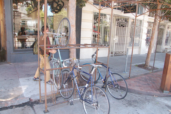 In the Mission District, the new Four Barrel parklet provides a standing-only coffee bar area and hanging bicycle parking, features which are intended to have a “less heavier” but more permanent feeling than other parklets, said Four Barrel owner Jeremy Tooker.