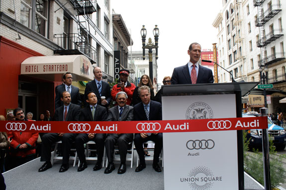 Lee lauded the spirit of cooperation on the project between the various city departments and the Union Square Business Improvement District. He called automobile company Audi a “great corporate citizen” for providing the $890,000 it took to construct the promenade, which became an immediate magnet for passersby.