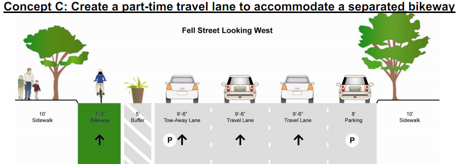 Just how the project would look will be determined through the SFMTA’s outreach, but replacing a car parking lane appears to have fewer obstacles than reclaiming a travel lane. While some car-owning neighbors have complained that there isn’t enough free parking to go around, the parking lot at the Department of Motor Vehicles (DMV) on Baker between Fell and Oak recently opened its roughly 120 parking spots to the public after-hours. The two parking lanes on the three blocks of Fell and Oak in question store roughly 80 cars.