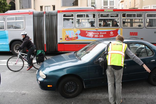 - July 9, 2010: SF Municipal Transportation Agency distributes fliers on-site to people driving about the new configuration of left turn queue lane into the Arco gas station.