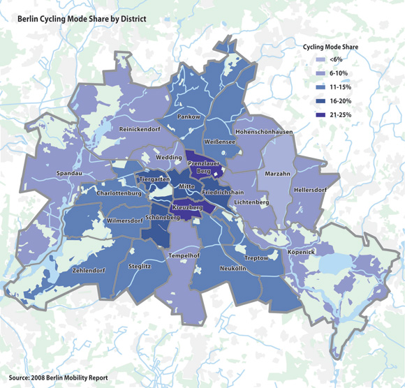 According to Berlin’s 2010 Mobility Report, Berliners made approximately 1.4 million trips by bicycle every day in 2008, amounting to 13 percent of all trips citywide (and 14 percent of commute trips). This figure has more than doubled since 1990, yet it is likely already outdated, given rising gas prices ($8/gallon in Berlin) and an aggressive city initiative to raise cycling mode share to 15 percent by 2015.