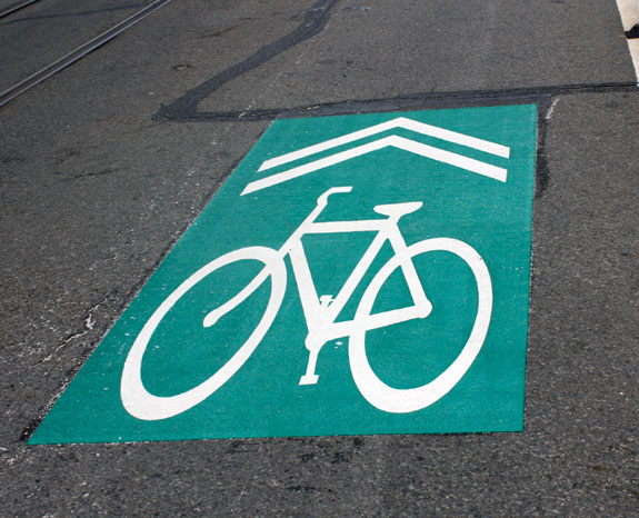 In the coming months, the SFMTA plans to install “green-backed” sharrows (seen already on Market Street at Van Ness) and continental crosswalks (a.k.a. “zebra-striped” — one was installed along Steiner last year) along the route from Steiner to Scott Streets, states an SFMTA report [PDF] submitted to the SF Bicycle Advisory Committee last week. The report also mentions that “wayfinding and traffic engineering improvements to the Market/Duboce/Buchanan intersection are under consideration.” The critical bikeway link on Fell and Oak Streets, connecting the Wiggle to the pathway on the Panhandle, will also come next winter — a few months sooner than recently reported — according to an SFMTA presentation.