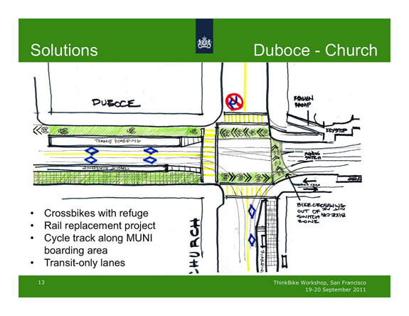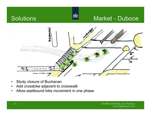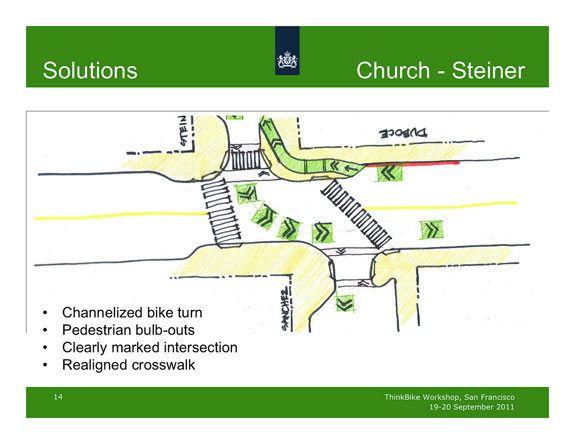During the two-day ThinkBike workshops, planners took a ride along three of the city’s main bike corridors: Market Street, Polk Street, and the Wiggle. Drawing on Dutch expertise, the groups sketched conceptual re-imaginings of the streets and listed recommendations for a more pedestrian- and bike-friendly environment. This year will see the first of those ideas [PDF] implemented on the Wiggle.