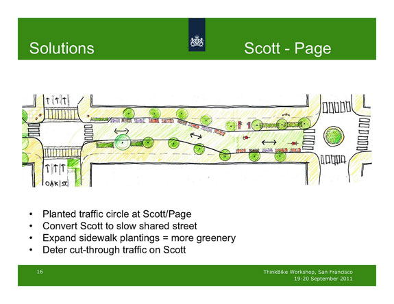 While Page and Pierce — the corner where Krengel was ticketed — isn’t technically on the Wiggle, Scott Street (one block over) could benefit from concepts sketched at ThinkBike. Many drivers and bicycle commuters move quickly through the somewhat wide intersection of Scott and Page, which lies next to a slope on Page — another popular bike route.