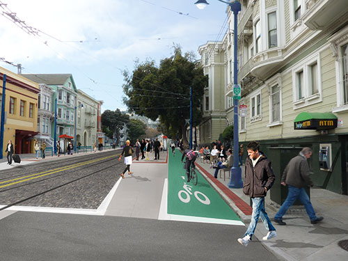 Come summer, the Church and Duboce Track Improvement project is expected to be completed with an exclusive green bike “channel” on Duboce near the Church intersection, connected by paint markings guiding bike riders across rail tracks in the intersection, said SFMTA planners. Green-backed sharrows will also be installed on Duboce to complement the others, and other improvements include new lighting, wider sidewalks and boarding islands, greening, new pavement treatments, sculptures, and more.
