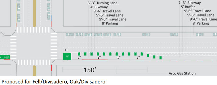 The plan uses green pavement treatments to emphasize a number of bike markings, including bike boxes, “super” sharrows where bikes and cars mix, and bike lane “entrances” at the beginning of each block. The approach at the intersection of Fell and Divisadero Streets, where green markings have already been added to reduce conflicts with drivers queuing up for the Arco gas station, would remain mostly as it is, though a bike box would be added.