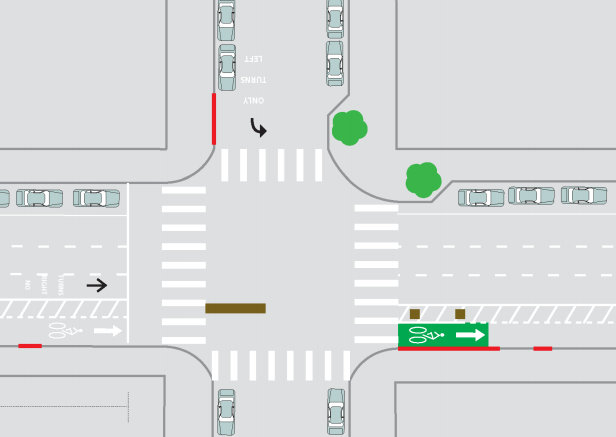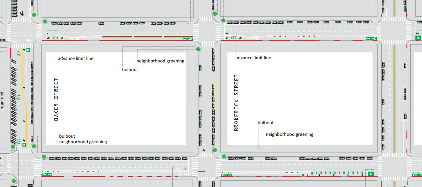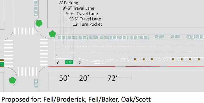 At Oak and Broderick Streets, drivers would be prohibited from turning right across the bike lane onto southbound Broderick using a physical barrier. That would also prevent through-traffic on Broderick from crossing Oak in the southbound direction.