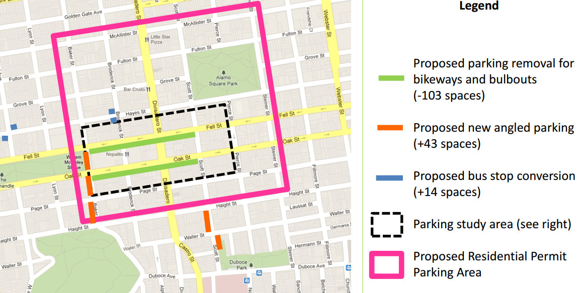 Fourteen more parking spaces would be created on Hayes Street by removing bus stops at Broderick Street and Central Avenue, which could also speed up travel times on the 21-Hayes line.