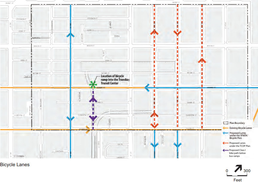 Bike improvements include a block-long, off-street bike path from Folsom to Howard (between 1st and 2nd) feeding a bike ramp directly into the transit center. Conventional bike lanes would also be added to Fremont, Beale, and Main Streets between Market and Folsom, with a bike box at Beale and Howard.