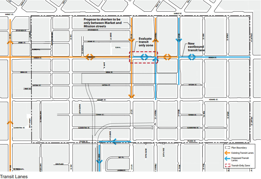 Major streets — Mission, Howard, New Montgomery, Second, First, and Fremont Streets — would get wider sidewalks, road diets, transit lanes, and boarding islands. The planning department is also looking at creating a transit-only plaza on Mission between First and Fremont.