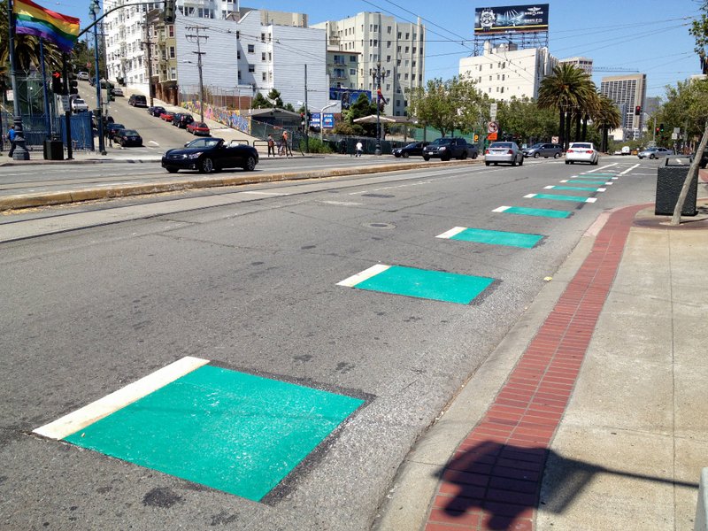 An SFMTA document [PDF] says the agency chose the locations to evaluate how the treatments affect merging behavior as drivers cross over bike lanes into right-turn lanes.
