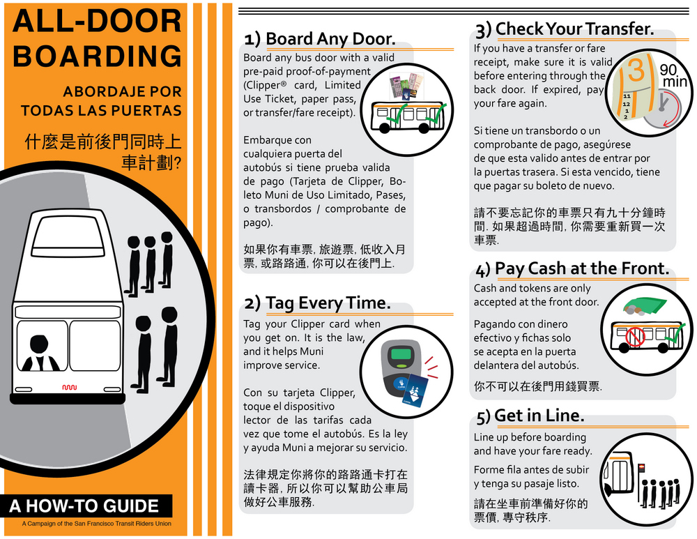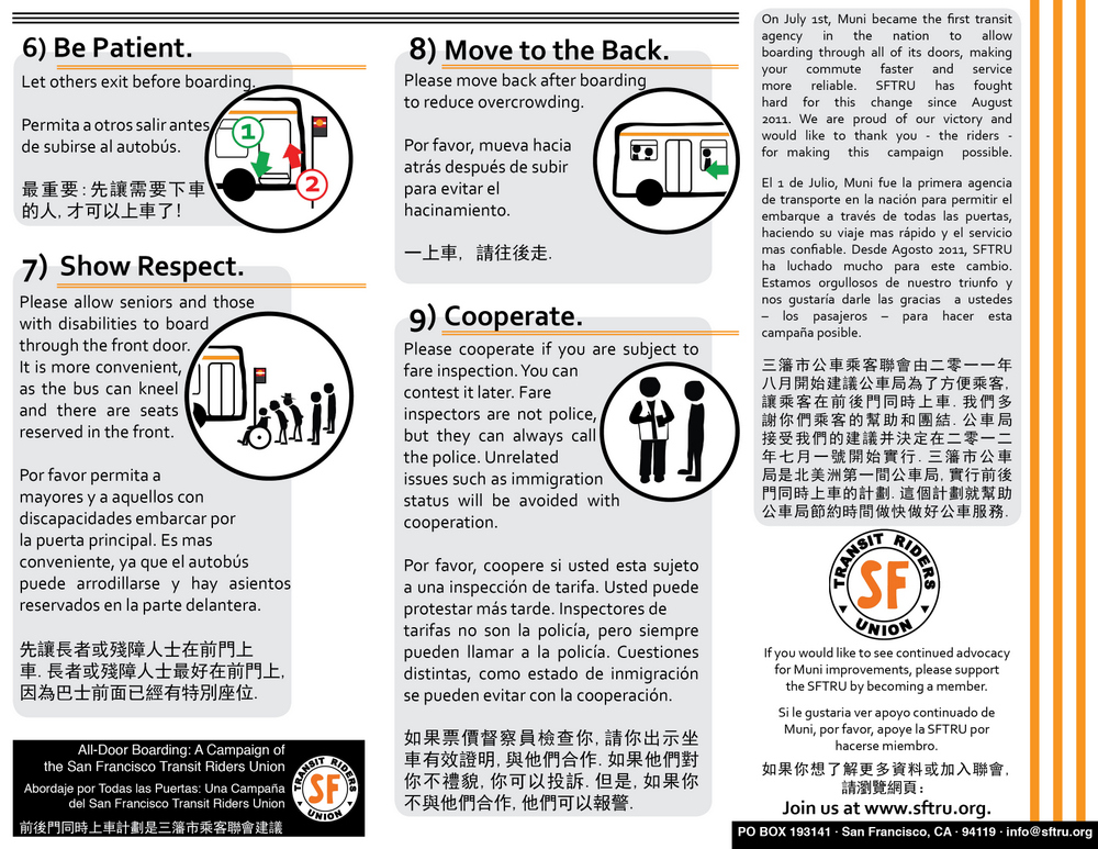 With Muni all-door boarding underway, other transit agencies are watching and bus riders are catching on — hopefully. To ensure a smooth transition to the new policy — which will help Muni maximize the benefits of faster boardings and higher fare compliance — the SF Transit Riders Union has created a brochure explaining the rules and etiquette of the all-door boarding system.