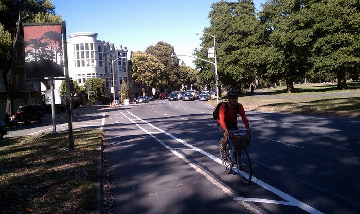 In the finishing touches connecting JFK to the Panhandle, the SFMTA striped an eastbound buffered bike lane striped along the center median on part of Kezar Drive, which had already been used unofficially for years.