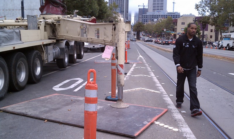 But the attention brought on by the Streetsblog post apparently helped the SF Bicycle Coalition remedy the situation at 1844 Market Street. “Thanks to that article, we worked with [SF Municipal Transportation Agency] Permitting Division to order the construction company to complete that phase of the project by 5:00 PM, to help reduce disruptions to evening bicycle traffic,” SFBC Program Manager Marc Caswell wrote in today’s weekly SFBC member newsletter. “And, when they need to close the right lane during the day, they will be required to have a person directing traffic and the construction company will position the truck so bicycle riders can ride past without entering the track lane.”