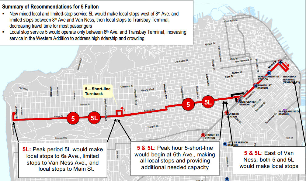 Limited-stop service on the 5 was one of the recommendations in the Transit Effectiveness Project, along with removing 16 regular stops on the line as a way to speed up service. The SFMTA said it ran a version of 5-Limited service to alleviate crowding during the Outside Lands music festival last weekend between 25th Avenue and the Civic Center BART station.