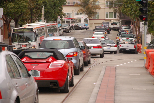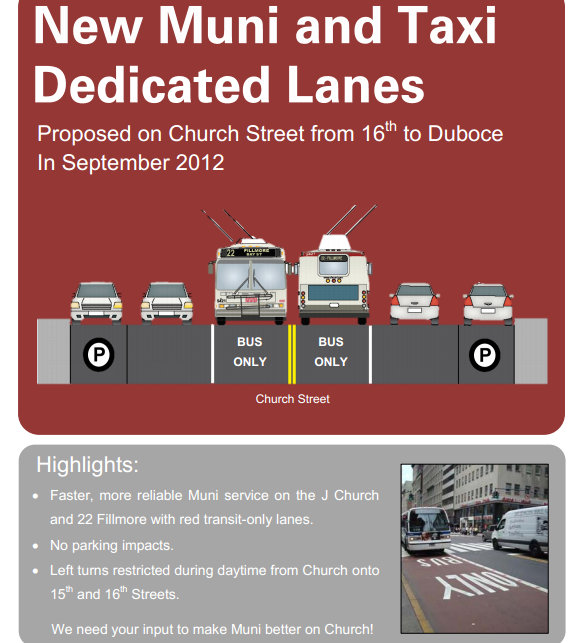 Staff from the SFMTA’s Transit Effectiveness Project will hold a public meeting on Monday evening to explain the proposal, which would create red transit lanes on Church between Duboce Avenue and 16th Street — one of the “slowest portions of both the J Church and 22 Fillmore lines,” according to an SFMTA flyer [PDF]. As many Muni riders know, on streets like Church and Market, cars in front of transit vehicles — moving or parked — are a common cause of delay. Transit lane violations are rampant, especially on streets like Market, where drivers often prevent buses and streetcars from loading passengers at boarding islands, forcing them to wait until the next traffic light cycle.
