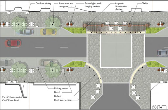 James Engels of RHAA Architects said the bulb-outs will be 80 to 100 feet wide, and the at-grade intersections and sidewalks will be comprised of pavers and concrete. “The material palate will promote a richer experience,” he said, adding that the parking stalls can be used as parklets, allowing restaurants to spill out into the street.