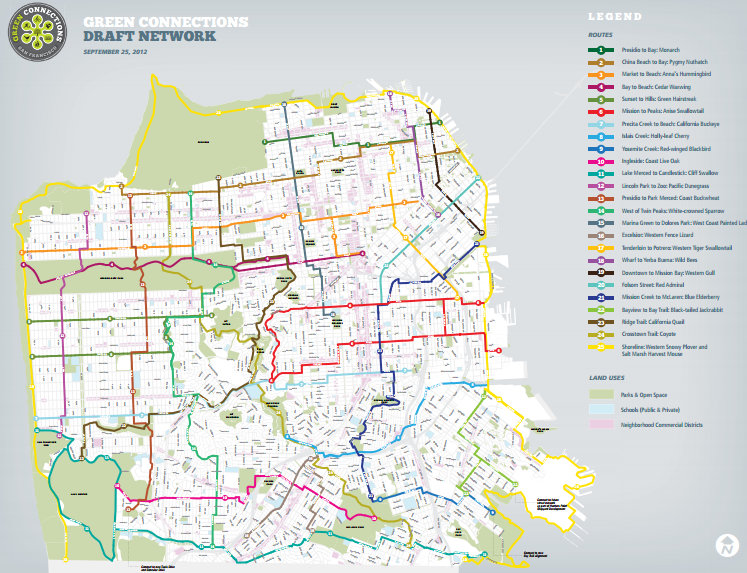 City planners continue developing a vision for a network of lush, pleasant streets prioritized for walking and biking between the city’s parks and waterfronts. Staff from the SF Planning Department plans to present its draft network [PDF] for the “Green Connections” project at an open house next Wednesday, October 3, and the public is invited to weigh in on the selected routes.