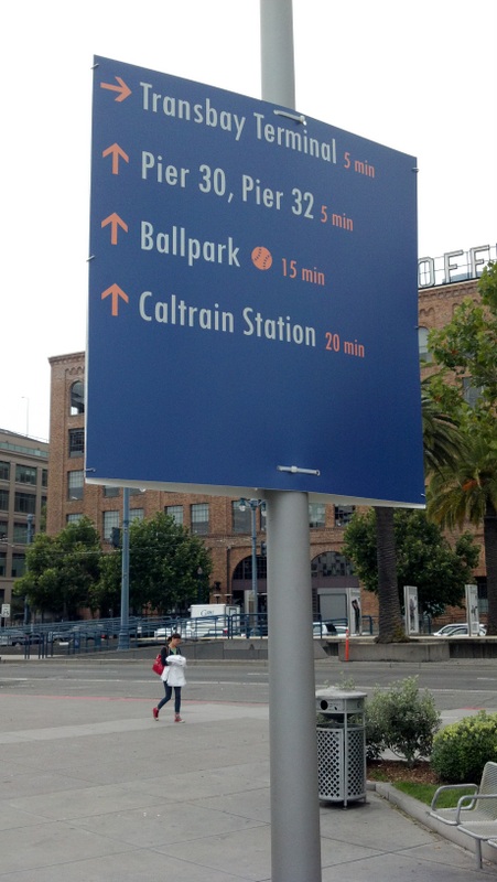 The signs at the Embarcadero were put in by the SF Municipal Transportation Agency to help point visitors to, from, and along the waterfront during the America’s Cup yacht races this year and next summer. They were recommended in the People Plan, which is aimed at making it easier for visitors to walk, bike and take transit to the crowded events.