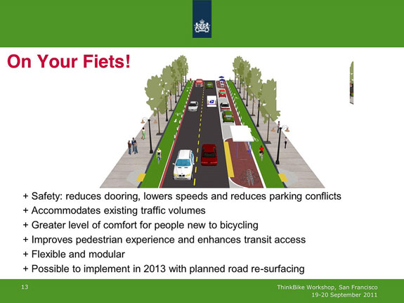 Polk was one of the corridors where Dutch bicycle planners joined the SFMTA on a ride one year ago to re-imagine it as a more pedestrian- and bicycle-friendly street using methods practiced in the Netherlands, which is known for its exceptionally safe street designs. The recommendations that resulted included expanding pedestrianized areas and providing continuous, parking-protected bike lanes — an idea also called for in the SF Bicycle Coalition‘s Connecting the City campaign as a safe, relatively flat connection linking Market Street to Fort Mason and Fisherman’s Wharf.