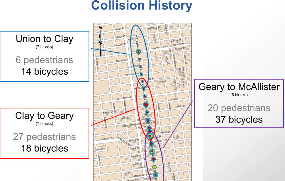 Intersected by a number of wide, high-speed, one-way streets, Polk sees an unusually high rate of pedestrian and bicyclist injuries. From 2006 to 2011, 20 pedestrians and 37 bicyclists were hit on the six blocks between McAllister and Geary Boulevard alone, according to data provided by the SFMTA from the Statewide Integrated Traffic Records System (SWITRS).