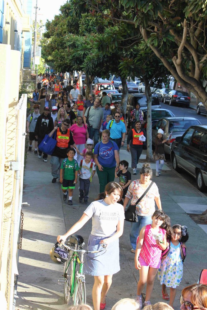 A continuous "walking bus" of school children spanned several sunny blocks of the Mission this morning as the kids made their way to Buena Vista Horace Mann School.