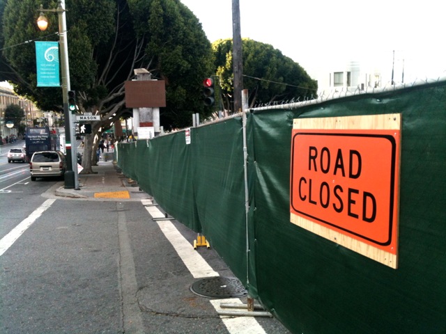 Putting another nail in the coffin of falsely-predicted traffic jams, a block of Mason Street has been permanently closed to motorists for the construction of a plaza as part of the expansion of the North Beach Public Library.