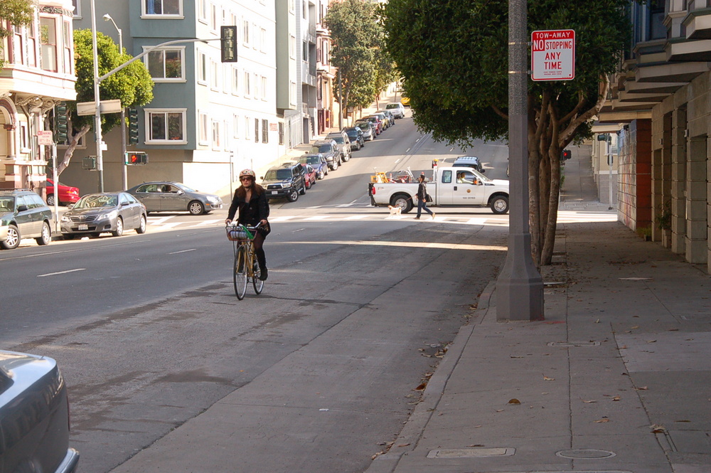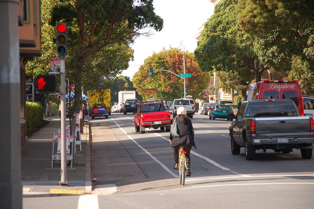 Although a few parked vehicles remain on the curb, along with the regular queue of drivers at the Arco gas station (which the new bike lane won’t remove), the absence of curbside parking gave bike commuters and tourists a taste of what it’s like to have more breathing room on the crucial westbound link from the Wiggle to the Panhandle.