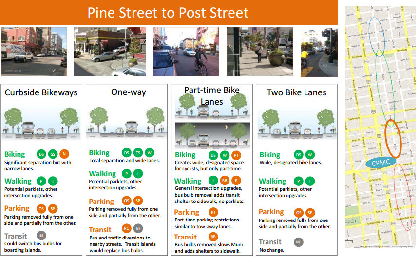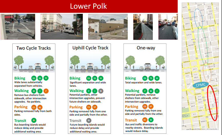 Planners at the SF Municipal Transportation Agency this Saturday unveiled options for redesigning Polk Street as a better place for walking, biking, socializing, and transit. The proposed concepts [PDF] show different ways to arrange the limited amount of street space for traffic lanes (which serve buses on Muni’s 19-Polk line), bike lanes, expanded pedestrian areas, and spots for vehicle loading and parking.