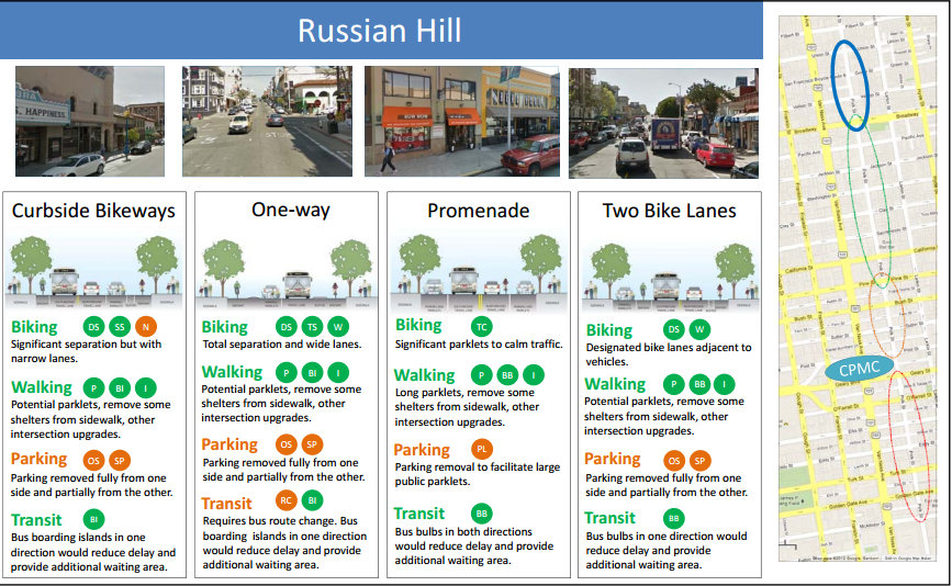 Planners said the proposals were developed based on input from community meetings and walking tours over the past two months. Given the limited amount of space, all of the concepts would remove car parking from one or both sides of the streets for at least part of the day. According to the SFMTA, the on-street parking on Polk between McAllister and Union Streets (the project area) makes up just 7 percent of the parking supply along the corridor, defined as the area within one block of the street.