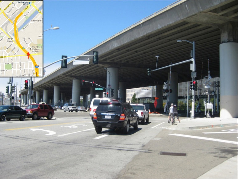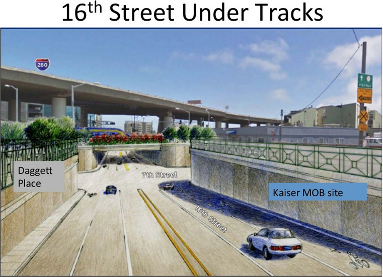If the freeway is left to stand, its pillars would present an engineering obstacle to running the train tracks undergound, meaning the only other feasible way to allow rail tracks to safely and expediently cross 16th Street would be to dip 16th underneath the tracks. And that would make the intersection — a gateway to Mission Bay — even more hostile for people walking and biking than it already is.