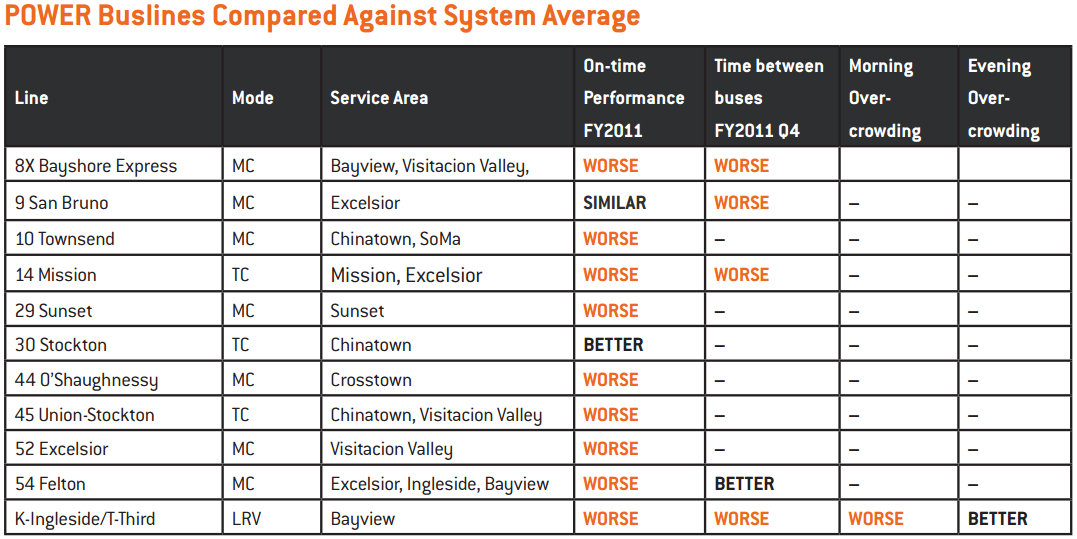 Based on data on Muni’s reliability in low-income neighborhoods, POWER’s report states that “the on-time performance on each of these lines in Southeast San Francisco is significantly worse than the system average” of less than 60 percent.