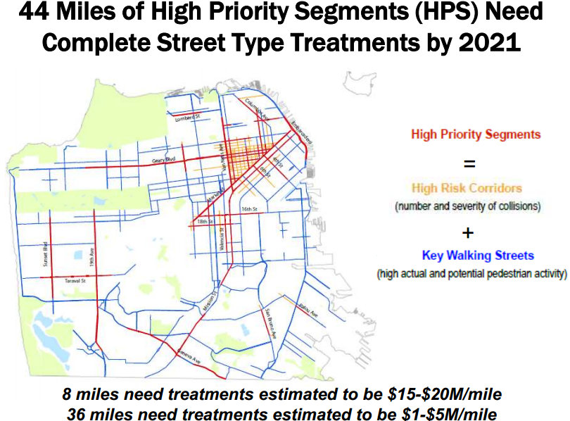 To implement the Pedestrian Strategy, the SFMTA estimates it would need an additional $33 million each year, more than double the amount expected to be available for pedestrian improvements. Given the abysmal state of dedicated funding for pedestrian safety, the strategy identifies 35 high-priority pedestrian streets where transit, road re-paving, and other projects could potentially be used to leverage funding by including pedestrian upgrades in the projects.