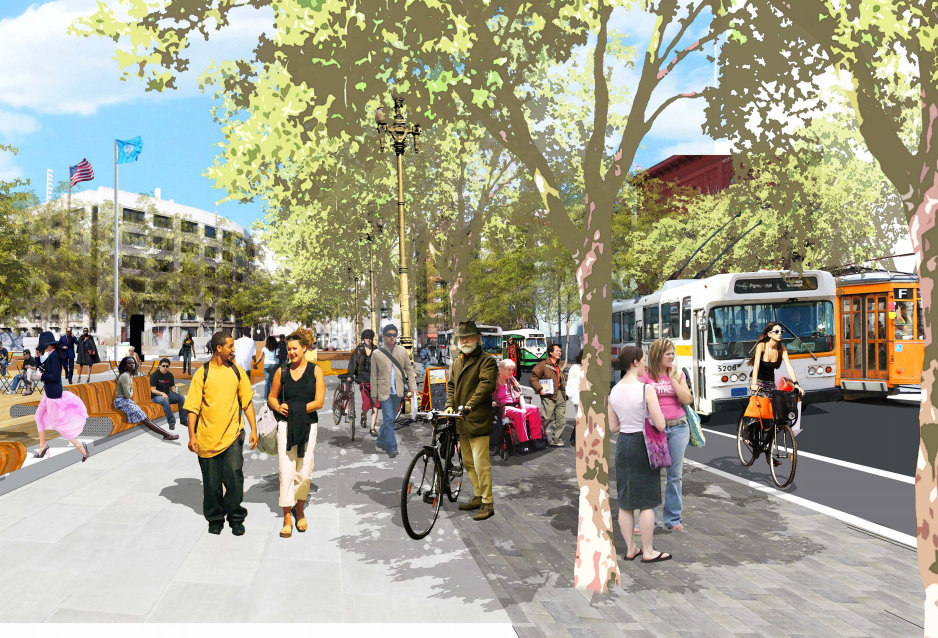 Reiskin agreed, saying that the main downside to building protected bike lanes on Market is that some of the real estate would come from the sidewalks. He also acknowledged, “Its strongest point is that Market Street, as we can see out there today, is a natural place where cyclists go, so to the extent that we can get a ‘Class 1’ facility on Market Street, that’s a very strong selling point for this option.” (“Class 1” is the CA Highway Design Manual’s term for physically protected bikeways.)