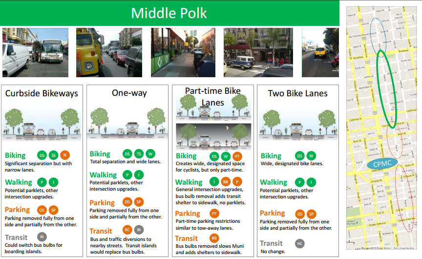 While the SFMTA has engaged residents in a community-based planning process for Polk from the outset, project supporters were scarce last night. D3 Supervisor David Chiu, who usually talks a good game on street safety, has not taken a position on the project.