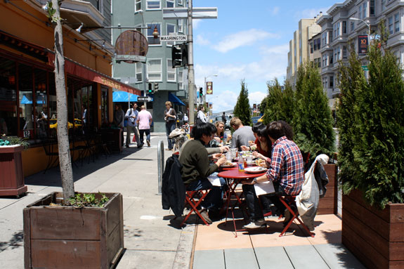Today, businesses on and near Valencia have added nine parklets, typically replacing two parking spaces each. Parklets are catching on on Polk, too.
