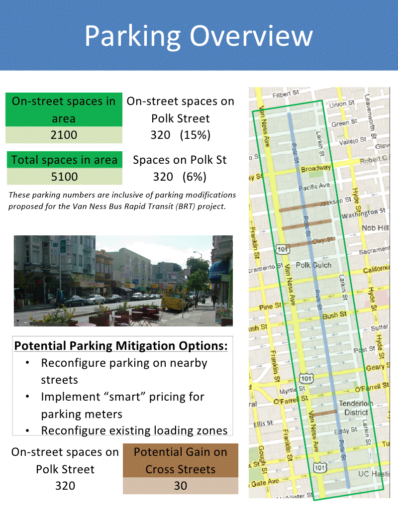An updated SFMTA count of parking along the project's 20-block corridor of Polk. As we’ve reported, the amount of parking that might be removed under the SFMTA’s proposals for Polk is only a tiny portion of the parking supply. The SFMTA has actually refined its parking counts, and now reports a total of 5,100 parking spaces within a block of the project corridor — 800 more than previously known. That means the portion represented by Polk’s 320 on-street parking spaces is just 6 percent, down from the original estimate of 7 percent. When looking at on-street parking spaces only, the parking on Polk still represents just 15 percent.Since none of the safety improvements proposed by the SFMTA would remove more than half the on-street parking on Polk itself, no more than 3 percent of the corridor’s parking supply would be touched.