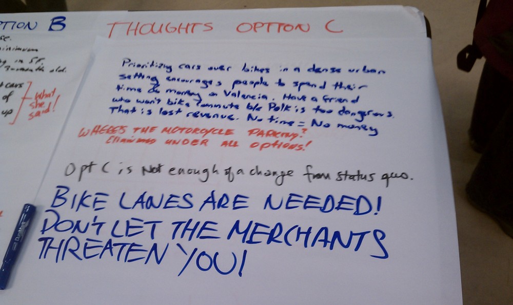 The SFMTA presented the designs to the public at an open house on Saturday, and will hold another one Tuesday evening. In the last hour of Saturday’s meeting, the venue was packed with what appeared to be a crowd with fairly mixed opinions. Most of the comments written on the boards, seemed to stem from passionate beliefs that safety should come before car parking.