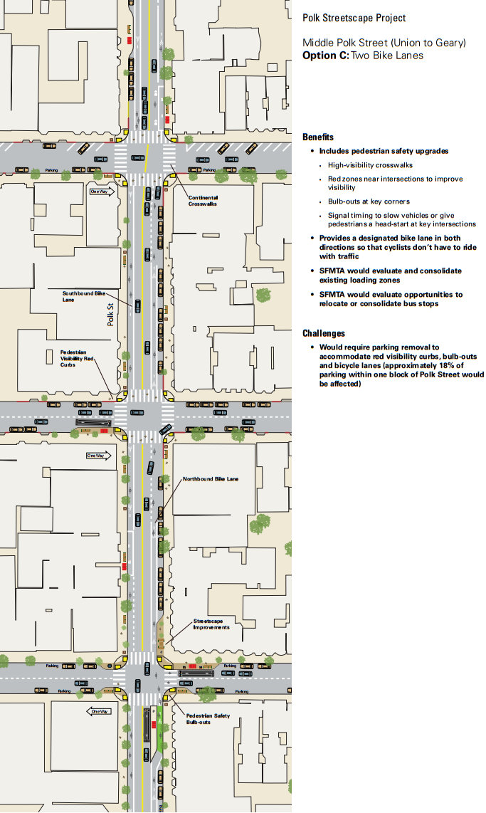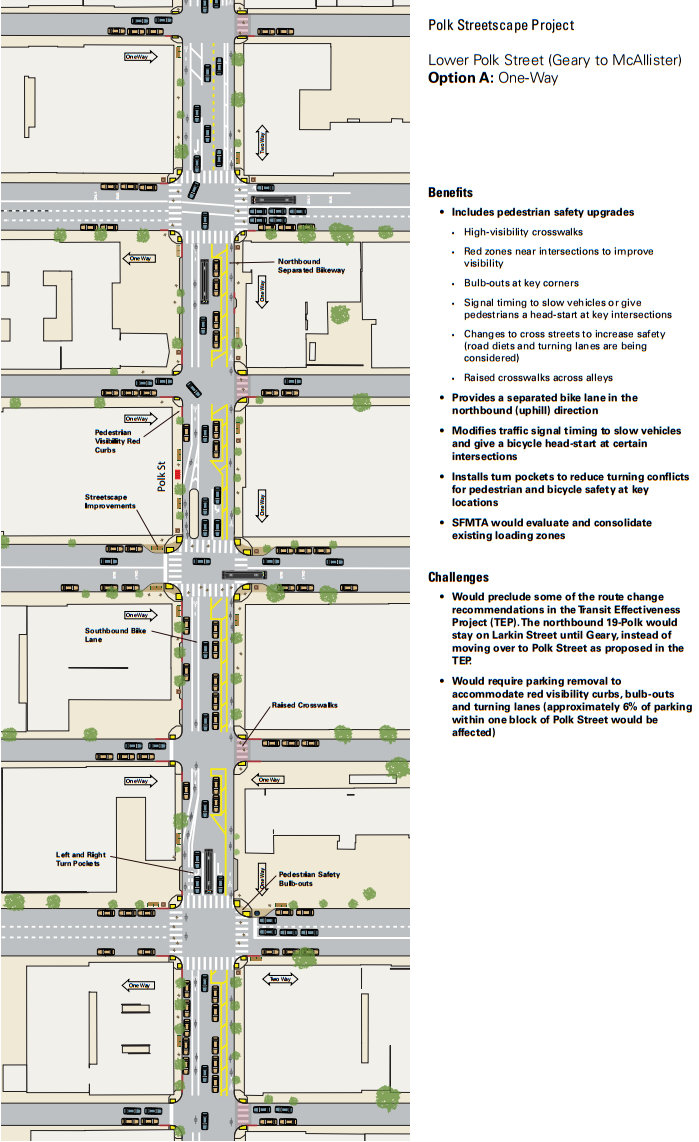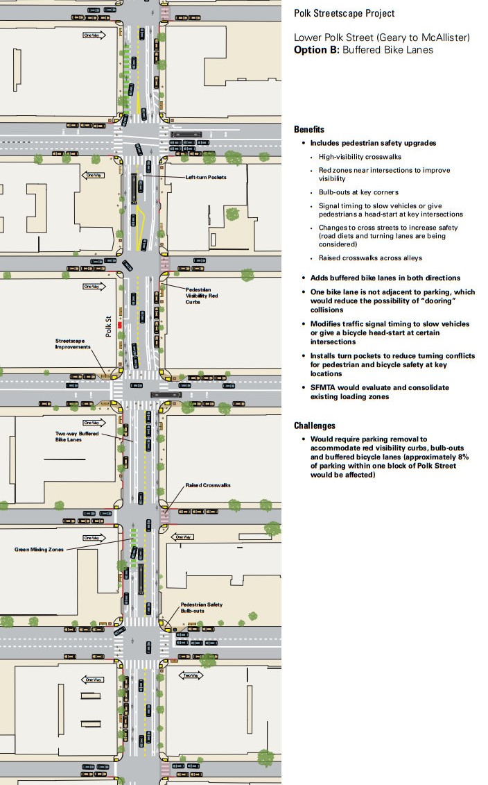 On the six-block stretch of Polk south of Geary to McAllister, the SFMTA does provide an option for protected bike lanes that would eliminate northbound motor traffic (precluding a potential re-route of the 19-Polk onto the street) and preserve much of the parking. Another option for that stretch would create buffered bike lanes with mixed levels of protection, running curbside on some stretches, between parked cars and moving cars on others.