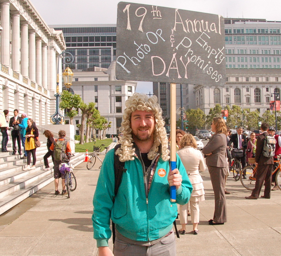 Perhaps no one is more skeptical of the politicians’ annual show of pro-bike rhetoric than Morgan Fitzgibbons, co-founder of the Wigg Party, a group that promotes sustainability in the neighborhood around the Wiggle bicycle route. Fitzgibbons stood behind the mayor during his speech, holding a sign that, on one side, read, “19th Annual Photo Op & Empty Promises Day.” On the other: “All Talk.” Fitzgibbons said he was asked by police to leave the steps of City Hall.