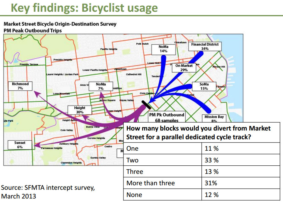 To make the case for the Mission alternative, Andrew Lee, the SFMTA’s lead planner on the project, presented [PDF] a recent survey showing that many current bicycle riders would be willing to detour a number of blocks to use a protected bike lane. (KTVU also introduced the idea to folks on the street yesterday, finding one bike messenger who favored the idea, and a few cabbies who seemed to be unfavorable toward adding any bike lanes.)