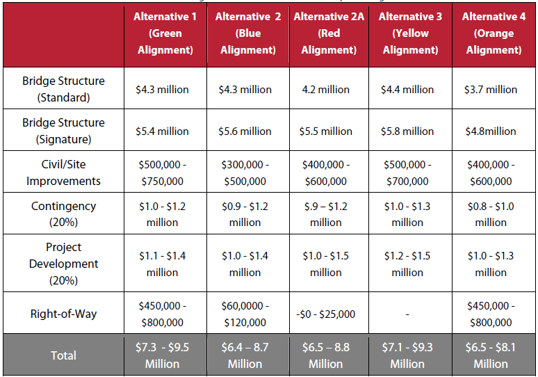 Estimated construction costs range between $6.5 and $9.3 million, depending on the design. For each option, costs would increased as much as $1.4 million if the city opts for a “signature” bridge design, like the suspension bridges over I-80 at Berkeley’s University Avenue and Cupertino’s Mary Avenue bridge over Highway 280.