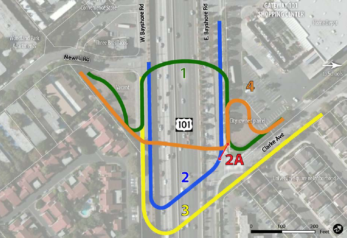 On the west side of 101, the various options would either place the bridge ramp along West Bayshore Road (a frontage road) with the entrance at Newell Road, or on a vacant, privately-owned parcel where the two roads intersect.
