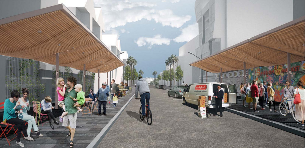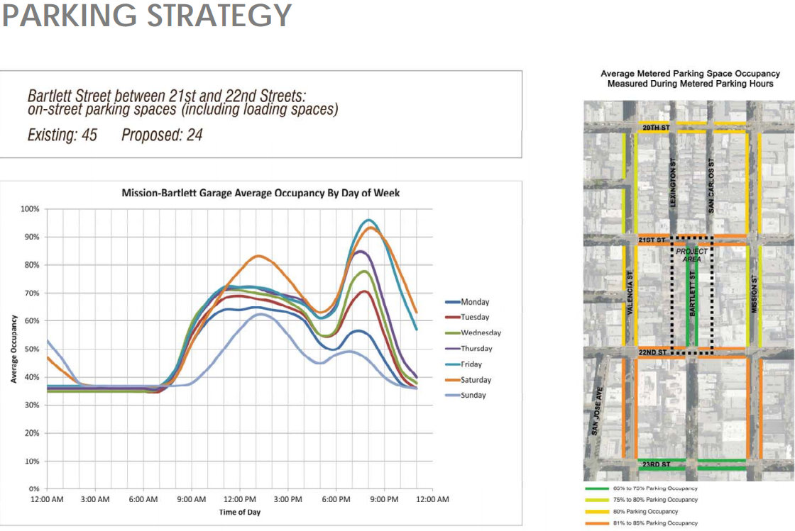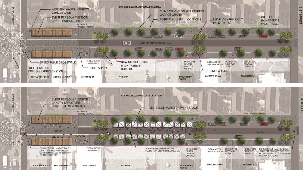 The final designs for a people-friendly block of Bartlett Street in the Mission were presented [PDF] last week by the Planning Department, Department of Public Works, the SFMTA, and the design firm Rebar. The plan retains the sidewalk extensions that are key to calming traffic and inviting social activity outside of events like the weekly Mission Community Market, when the block is closed to cars.