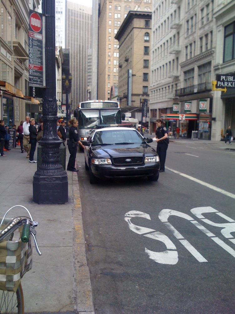 It may be a stereotype, but cafes and donut shops actually do seem to be magnets for illegally parked city vehicles — regardless of the blockages that result. Here, Claire Vlach spotted a couple of cops making a stop at La Boulange, blocking the transit lane on Sutter Street and delaying a number of Muni lines, like the notoriously overcrowded and sluggish 30-Stockton: